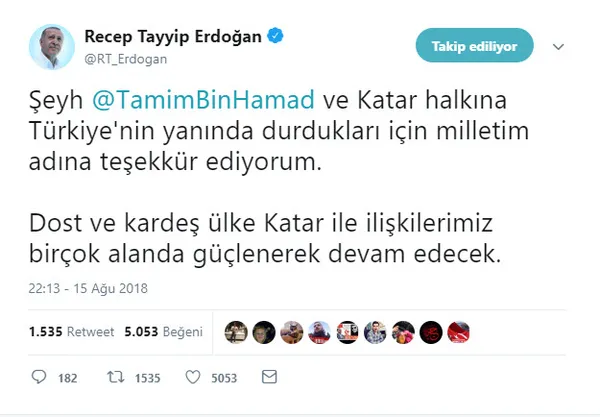 Başkan Recep Tayyip Erdoğan, "Şeyh Hamed Al Sani ve Katar halkına Türkiye'nin yanında durdukları için milletim adına teşekkür ediyorum." ifadelerini kullandı.