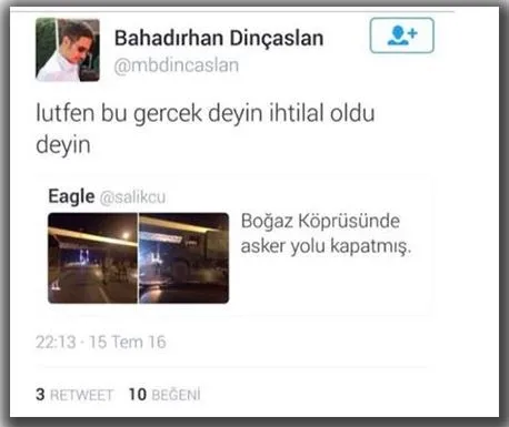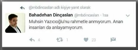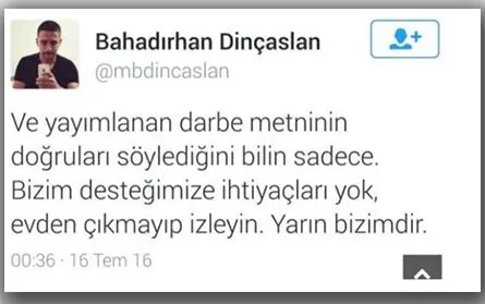 Dinçaslan'ın, "Ve yayımlanan darbe metninin doğruları söylediğini bilin sadece. Bizim desteğimize ihtiyaçları yok, evden çıkmayıp izleyin. Yarın bizimdir" ve "Lütfen bu gerçek deyin, ihtilal oldu deyin" şeklindeki paylaşımları ve Muhsin Yazıcıoğlu'na yönelik ithamları üzerine İYİ Parti Grup Başkanvekili ve İstanbul Milletvekili Yavuz Ağıralioğlu, sert bir şekilde tepki gösterdi.