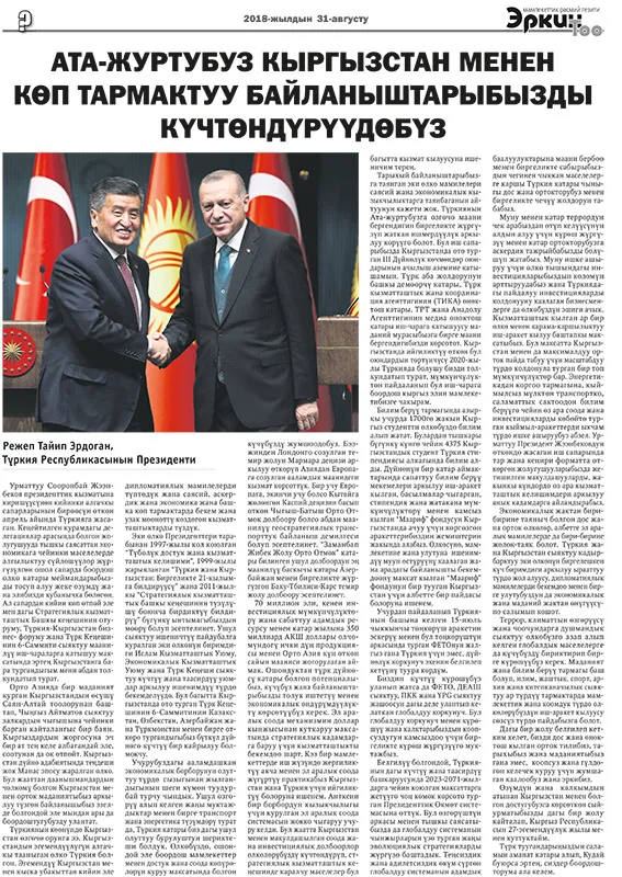 Cumhurbaşkanı Recep Tayyip Erdoğan, yarın gerçekleştireceği Kırgızistan ziyareti öncesinde ülkedeki Erkin Too gazetesi için Türk-Kırgız ilişkilerine dair bir değerlendirme kaleme aldı. "Ata Yurdu Kırgızistan'la Çok Yönlü Bağlarımızı Güçlendiriyoruz" başlıklı yazı, gazetenin hem manşetinde hem de iç sayfasında geniş şekilde yer aldı.