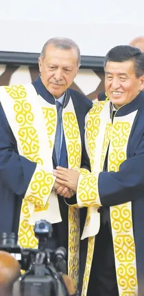 Manas ?Üniversitesi'ndeki fahri doktora töreninde konuşan Kırgızistan Cumhurbaşkanı Sooronbay Ceenbekov, "Erdoğan ile Kırgızistan'da sağlık alanında büyük bir başarıya imza attık. Türkiye'deki klinikler bile tam donanımlı ve teşekküllü olarak hizmet veriyor. Türk kardeşlerimizle her türlü iş birliğine hazırız. Manas Üniversitesi, Kırgızistan-Türkiye ilişkilerinin en başarılı örneğidir. Üniversitenin kardeşliğimize, dostluğumuza ve etnik barışa katkısı büyüktür" dedi.