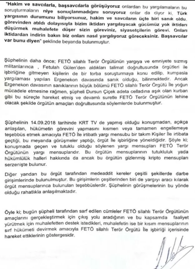 "Şüpheli Dursun Çiçek'in 14 Eylül 2018 tarihinde KRT TV de yapmış olduğu konuşmadan, açıkça anlaşılan, hükümetin görevini yapmasını kısmen veya tamamen engellemeye teşebbüs etmek amacıyla FETÖ İle irtibatlı yargı mensubu bir takım kişiler İle irtibata geçtiği, bu meyanda görüşmeler yaptığı, örgüt İle işbirliğine yöneldiğidir. Şöyle ki; konuşmada geçen ve tutuklu olduğu söylenen yargı mensupları FETÖ Terör Örgütünün yargı mensuplarıdır. Bu örgütün mensuplarının tutukluluk yada hükümlülük halleri hakkında da ancak bu örgütün gizlenmiş kripto mensupları serzenişte bulunur. Diğer yandan bu örgüt tarafından müdeaddit kereler çeşitli şekillerde darbe girişimlerinde bulunulmuştur. Bu girişimlerin çeşitlerinden biri de yargıyı aracı kılarak örgüt mensuplarınca bulunulan teşebbüslerdir. Şüphelinin görüşmelerinin bu yönde olduğu rahatlıkla anlaşılmaktadır."