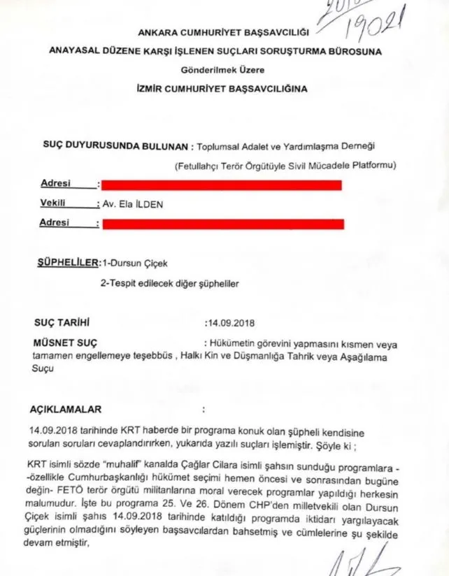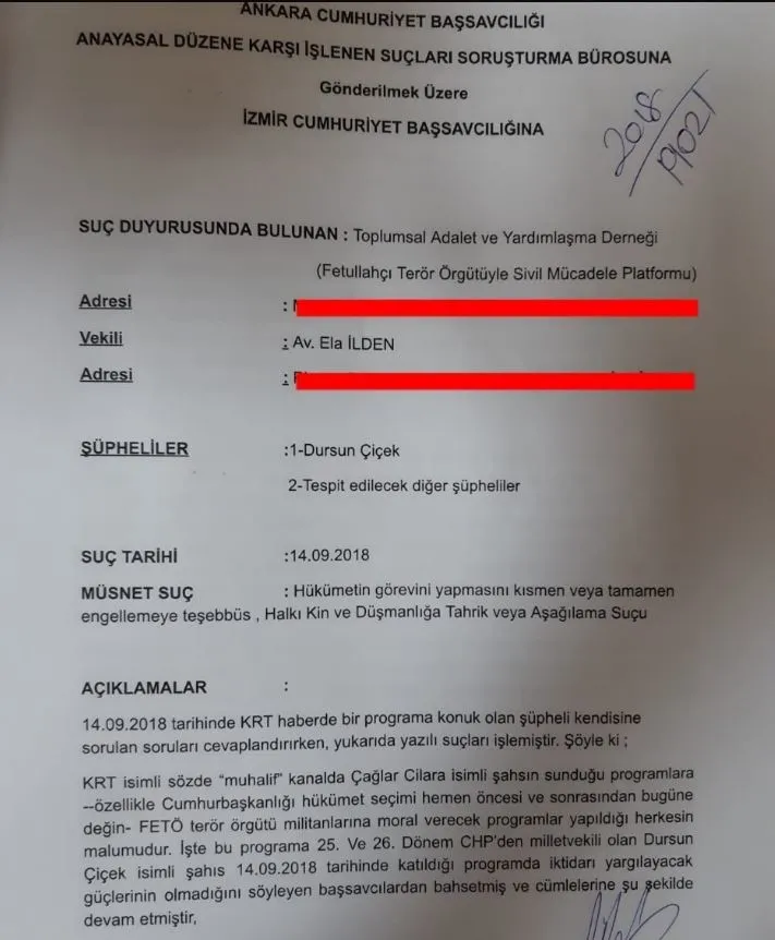 Toplumsal Adalet ve Yardımlaşma Derneği'nin suç duyurusunda, Dursun Çiçek'in, 14 Eylül 2018 tarihinde KRT Haberde yaptıkları açıklamalar hatırlatıldı.