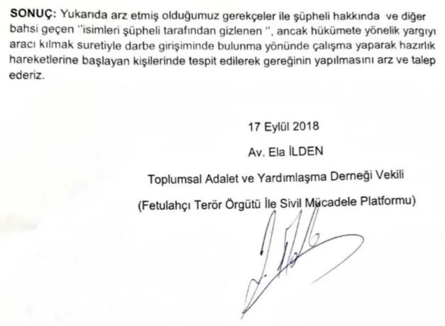 Toplumsal Adalet ve Yardımlaşma Derneği'nden avukat Ela İlden, Dursun Çiçek ve "isimleri şüpheli tarafından gizlenen" ancak hükümete yönelik yargıyı aracı kılmak suretiyle darbe girişiminde bulunma yönünde çalışma yaparak hazırlık hareketlerine başlayan kişilerinde tespit edilerek gereğinin yapılmasını istedi.