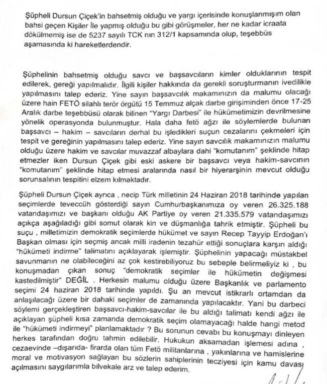 "FETÖ Silahlı Terör Örgütü hükümete yönelik tasarladıkları suçları hayata geçirmek için kolaylaştırıcı çıkış yolu aradıkları bu doğrultuda Dursun Çiçek İle görüştükleri de anlaşılmaktadır. Şüpheli Dursun Çiçek'in bahsetmiş olduğu ve yargı içerisinde konuşlanmış olan bahsi geçen kişiler İle yapmış olduğu bu gibi görüşmeler, her ne kadar icraata görüşme aşamasında kalmış ise de 5237 sayılı TCK'nın 312/1 kapsamında olup, teşebbüs aşamasında ki hazırlık hareketlerdendir."