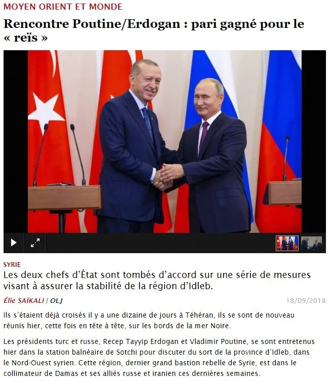 Fransız Liberation gazetesi, Erdoğan'ın haftalardır Şam rejiminin muhaliflere yönelik saldırı hazırlığı yaptığı İdlib'de 15 Ekim'den itibaren silahsız bölge oluşturulması için gerekli anlaşmayı Putin'den "kopardığını" yazdı. Haberde ayrıca, Ankara'nın İdlib'e yönelik Esad rejiminin bir saldırısını önlemek için aylardan beri mücadele ettiği ve bunda da başarılı olduğu kaydedildi.