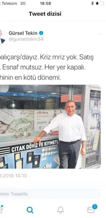 CHP İstanbul Milletvekili Gürsel Tekin'in İstanbul'da ticaretin kalbi olan Kapalıçarşı'da esnafın kepenk kapattığına yönelik iddialarının tamamen yalan olduğu ortaya çıktı. Gürsel Tekin dün cuma namazı saatinde Kapalıçarşı'ya geldi. Bu sırada esnaf namazda olduğu için dükkanların kepenkleri kapalıydı. Bu durumu fırsat bilen Tekin, Twitter hesabından yaptığı paylaşımlarla ekonomiye yönelik bir algı operasyonuna imza attı. Çıtak Döviz'in önünde çektirdiği bir fotoğrafını paylaşan Tekin, "Kapalıçarşı'dayız. Kriz mriz yok. Satış yok. Esnaf mutsuz. Her yer kapalı. Tarihinin en kötü dönemi" iddiasında bulundu. Ayrıca "Kepenk kapanmış. İstanbul Türkiye'de ticaretin kalbidir. Kapalıçarşı İstanbul'da ticaretin kalbinin attığı yerdir. Kalp atmıyor. İstanbul'da yeniden nabzı yükseltmek lazım. Değişim şart" ifadesini kullandı. SABAH, Tekin'in kepenk kapattığını iddia ettiği Çıtak Döviz'in sorumlusu Salih Bülbül'ü buldu. Döviz bürosunun 1980'lerden bugüne faaliyette bulunduğunu vurgulayan Bülbül, Tekin'in iddialarının doğru olmadığını söyledi.