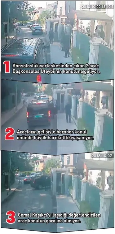 Olay gününe ait güvenlik kamerası görüntülerinde, Kaşıkçı'nın 13.14.36'da başkonsolosluk binasının girişinde olduğu, 1 saat 54 dakika sonra konsolosluk yerleşkesinden çıkan 2 aracın Başkonsolos Uteybi'nin konutuna gittiği görülüyor.