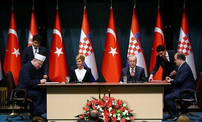 Hırvatistan Cumhurbaşkanı Kolinda Grabar Kitaroviç, dün Türkiye'ye resmi bir ziyaret gerçekleştirdi. Cumhurbaşkanı Erdoğan, Hırvat mevkidaşını Cumhurbaşkanlığı Külliyesi'de resmi törenle karşıladı. Cumhurbaşkanı Erdoğan ve Hırvatistan Cumhurbaşkanı Kitaroviç, baş başa ve heyetler arası görüşmeler yaptı. Görüşmelerde başta turizm, enerji, ticaret olmak üzere Suriye ve Irak başta olmak üzere bölgesel meseleler, Balkanlar'daki gelişmeler ve Türkiye- AB ilişkileri ele alındı. Görüşmelerin ardından iki ülke arasında iki işbirliği anlaşması imzalandı.