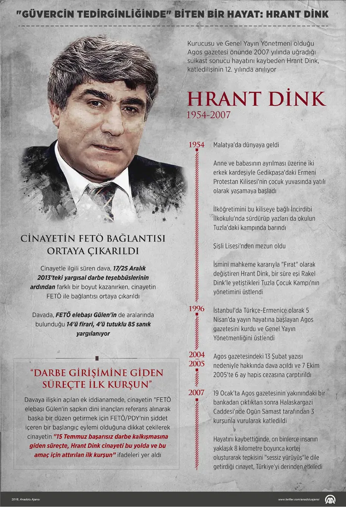 Kurucusu ve Genel Yayın Yönetmeni olduğu Agos gazetesi önünde, 2007 yılında uğradığı suikast sonucu hayatını kaybeden Hrant Dink, katledilişinin 12. yılında anılıyor. Hrant Dink'in katledilişi dün gibi hafızalarda yerini korurken, daha sonraki süreçte ortaya çıkan belgelerde, suikastte FETÖ'cü hainlerin rolü olduğu anlaşılmıştı...