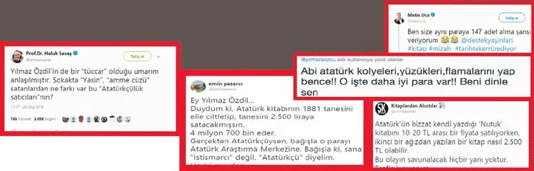 Özdil’in “Mustafa Kemal” kitabının 2 bin 500 liralık fiyatı için “Ucuz” imasında bulunması büyük tepki topladı. Sosyal medya kullanıcıları, Sözcü yazarı için ‘tüccar’ ve ‘istismarcı’ ifadesini kullandı