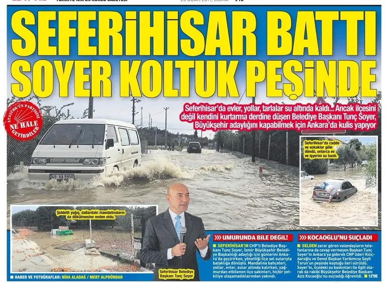 CHP'nin İzmir Büyükşehir Belediye Başkan Adayı olan Tunç Soyer, iki dönem görev yaptığı Seferihisar'da adeta bir enkaz bıraktı. Belediye çalışanların maaşları aksatmasına rağmen 175 kez yurt dışına çıkan Soyer, borç batağındaki Seferihisar Belediyesi'nin milyonluk arazilerini arka arkaya sattı. Son yağışlarda alt yapı yetersizliği nedeniyle ilçe tamamen sulara gömüldü. İşyerlerini su basan esnaf çaresiz haldeyken, Soyer'in 10 gün Ankara'da koltuk derdine düşmesi tepki topladı.