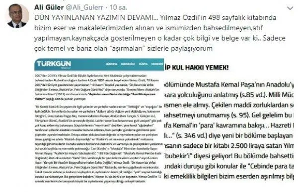 Güler, "Yılmaz Özdil'in 498 sayfalık kitabında bizim eser ve makalelerimizden alınan ve ismimizden bahsedilmeyen,atıf yapılmayan, kaynakçada gösterilmeyen o kadar çok bilgi ve belge var ki... Sadece çok temel ve bariz olan 'aşırmaları' sizlerle paylaşmak istiyorum." paylaşımıyla Özdil'in makalelerinden kullandığı kısımları paylaştı.
