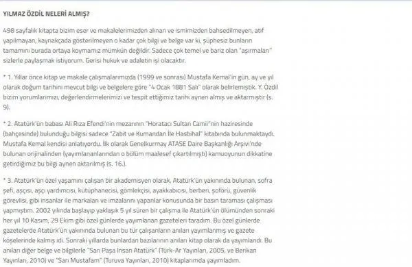 Kitabın içindeki bilgilerin teyidi noktasında birçok soru işareti sosyal medyada tartışma konusu olurken, Anıtkabir Derneği Yönetim Kurulu Üyesi Ali Güler, Yılmaz Özdil'in kitabındaki bilgilerin derneğin makalelerinden atıfsız ve kaynakçasız olarak birebir kopyalandığını açıkladı.