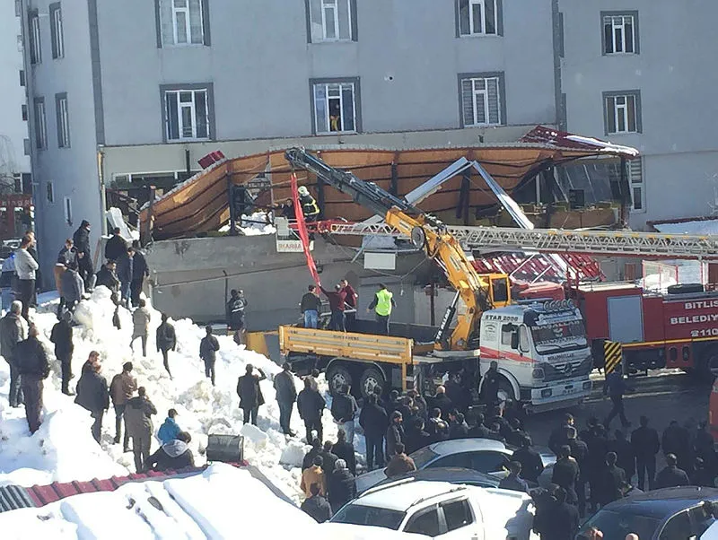 Bitlis'in Hüsrevpaşa Mahallesi'nde bulunan bir kafenin teras çatısı yağan karın ağırlığına dayanamayarak çöktü. O sırada kafede bulunanlardan 1'i hayatını kaybederken, 7 kişi de yaralandı. Olay yerine çok sayıda kurtarma ekibi sevk edilirken, yaralılar hastaneye kaldırıldı.