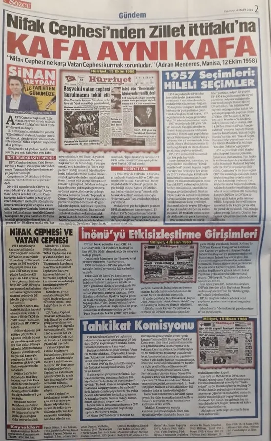 Demokrasi kahramanı Adnan Menderes’in darbeciler tarafından haksız ithamlarla idam edilmesini savunan Sözcü, tam sayfa yayınladığı haberde bu kez de Başkan Erdoğan’ı üstü örtülü şekilde tehdit ederek “Kafa aynı kafa” başlığını kullandı. Bu haberin yayınlandığı gün, PKK elebaşı Murat Karayılan’ın yerel seçimlerde CHP-İP-HDP-SP ittifakı’na destek isteyen sözleri dikkat çekti.