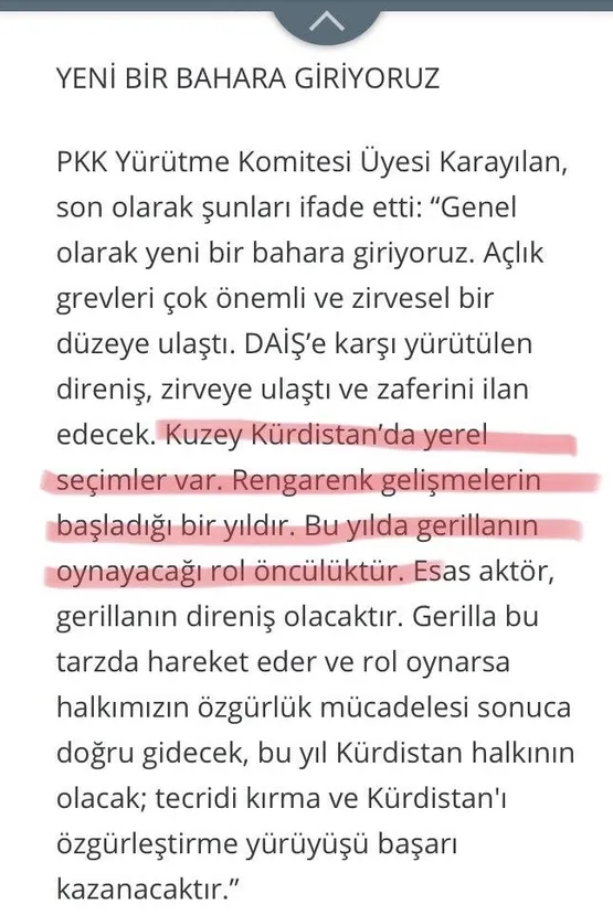 "Kuzey Kürdistan'da gerilla (teröristler) yerel seçimler için gerekeni yapacak." diyen terörist elebaşı Karayılan, PKK'nın "Kurulan ittifaka herkes sadık olmalı. (CHP-İP-HDP-SP ittifakı) AKP-MHP'ye karşı bir olmalıyız." görüşünü duyurdu.