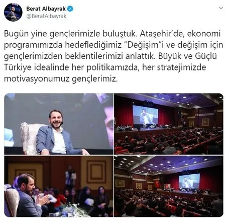 Bakan Albayrak, paylaşımında "Bugün yine gençlerimizle buluştuk. Ataşehir'de, ekonomi programımızda hedeflediğimiz "Değişim"i ve değişim için gençlerimizden beklentilerimizi anlattık. Büyük ve Güçlü Türkiye idealinde her politikamızda, her stratejimizde motivasyonumuz gençlerimiz." ifadelerini kullandı.
