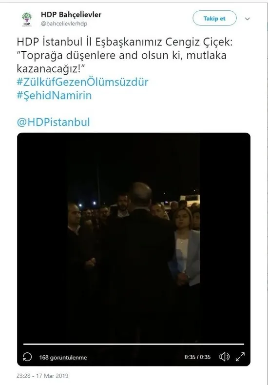 Polis memuru Hüseyin Özdemir'i Şehit eden PKK'lı terörist Zülküf Gezen'in Abdullah Öcalan için cezaevinde kendini asması sonrası HDP İstanbul İl Eşbaşkanı Cengiz Çiçek: "Seçim sürecinde sürece dahil sorumluluklarımızı yerine getirip mutlaka kazanacağız. Toprağa düşenlerimize and olsun" dedi..