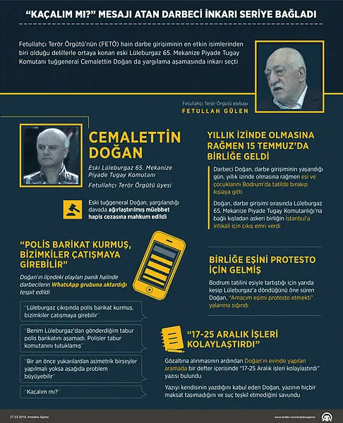 Fetullahçı Terör Örgütü'nün (FETÖ) 15 Temmuz'daki hain darbe girişiminin en etkin isimlerinden biri olduğu delillerle ortaya konan, dönemin Lüleburgaz 65. Mekanize Piyade Tugay Komutanı eski tuğgeneral Cemalettin Doğan da, yargılama aşamasında inkarı seçti.