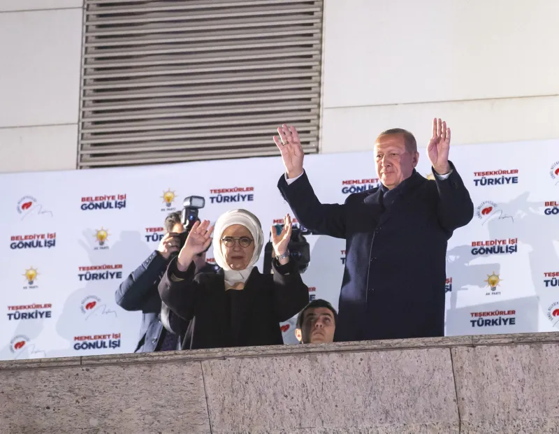 Erdoğan, parti genel merkezinin balkonunda vatandaşlara seslendi. Balkona, eşi Emine Erdoğan ile çıkan Cumhurbaşkanı Erdoğan, konuşmasının başında Kayahan'ın "Bizimkisi bir aşk hikayesi" isimli şarkısına eşlik ederek, vatandaşları selamladı.