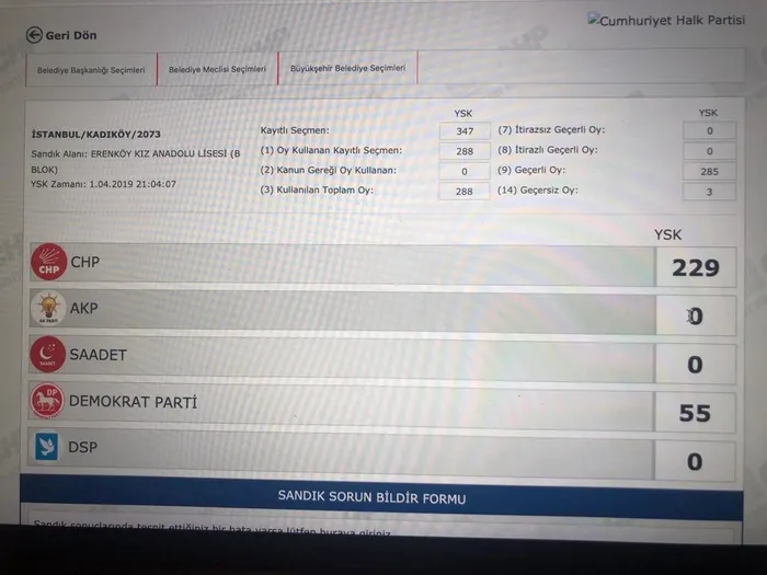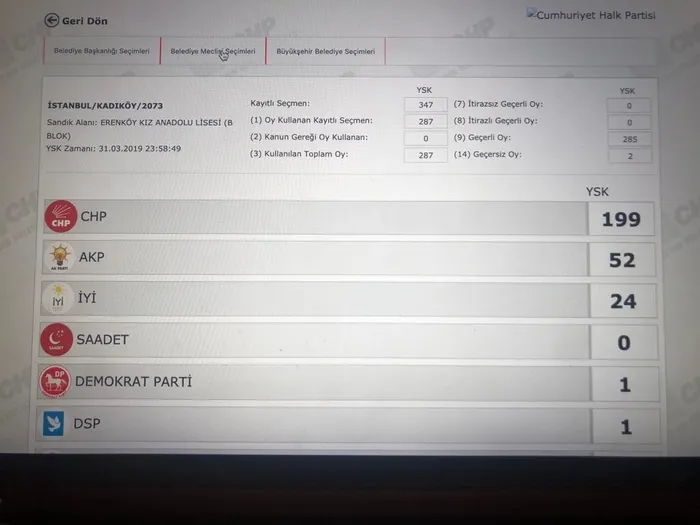 31 Mart yerel seçimlerinde, bazı ilçelerde hazırlanan yanlış tutanaklar, CHP'nin hazırladığı seçim sisteminde de kullanıcılar tarafından böyle görüntülendi. İstanbul Bağcılar’daki 1212 numaralı sandıkta ilçe belediye başkanları seçiminde AK Parti’ye 126 oy çıkarken, İstanbul Büyükşehir Belediye Başkanlığı seçiminde AK Parti’ye 1 oy yazılıyor