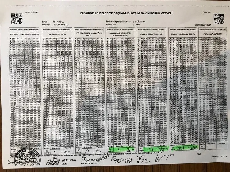 Sultanbeyli Adil Mahallesi'nde 2004 No'lu sandıkta Binali Yıldırım'ın 201 oy aldığı, seçim sandık tutanağında ise Binali Yıldırım'ın oyunu 1'e düşürüldüğü ortaya çıkarıldı. Yıldırım'ın aldığı 200 oyun gaspedildiği açıkça görüldü. Seçim sandık tutanağına geçirilen oylarda Ekrem İmamoğlu'nun 73 oyu Vatan Partisi adayına yazılırken, Binali Yıldırım'ın 201 oyu ise Ekrem İmamoğlu'na yazıldı. Binali Yıldırım'a ise Demokrat Parti adayının 1 oyu yazılarak sonuçlar manipüle edildi.