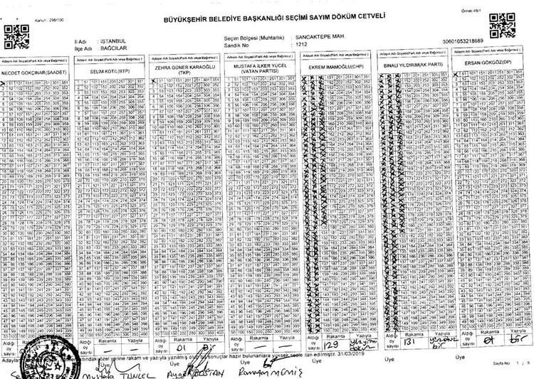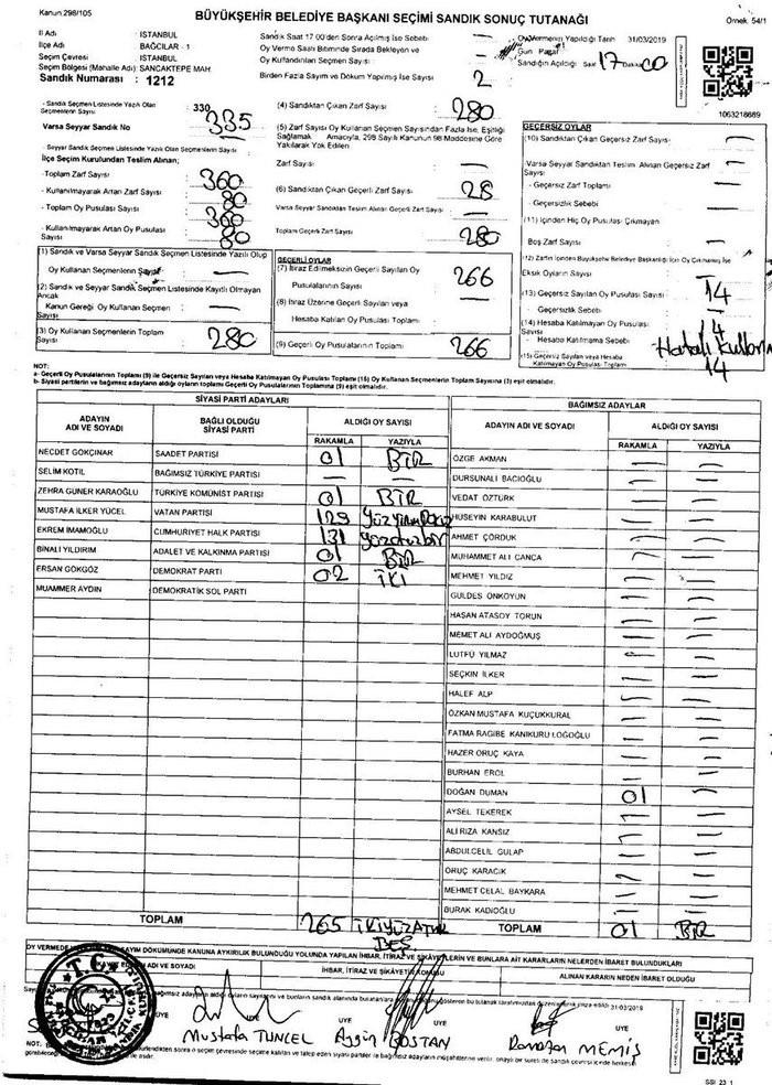Bağcılar Sancaktepe Mahallesi'ndeki 1212 No'lu sandıkta Binali Yıldırım'ın 131 oy aldığı, seçim sandık tutanağına 1 oy olarak yazıldığı belirlendi. Yıldırım'ın aldığı 130 oy seçim sandık tutanağına yazılmaması dikkat çekiyor. Binali Yıldırım'ın aldığı 131 oy CHP-HDP-İYİ Parti'nin İstanbul Büyükşehir Belediye Başkan Adayı Ekrem İmamoğlu'na yazıldı.