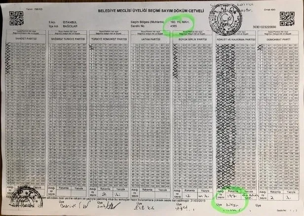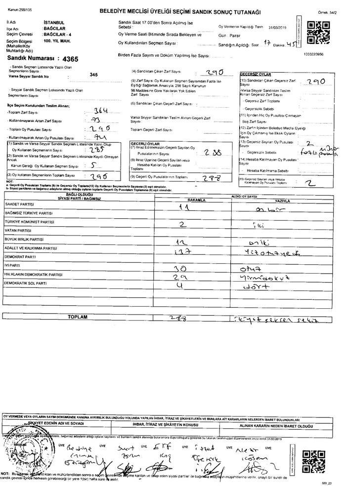 Bağcılar 100. Yıl Mahallesi'ndeki 4365 No'lu sandıkta ise belediye meclis üyeliği seçiminde AK Parti 197 oy almasına rağmen oyu 137'ye düşürüldü. AK Parti'nin aldığı 60 oy seçim sandık tutanağına eksik yazılmış
