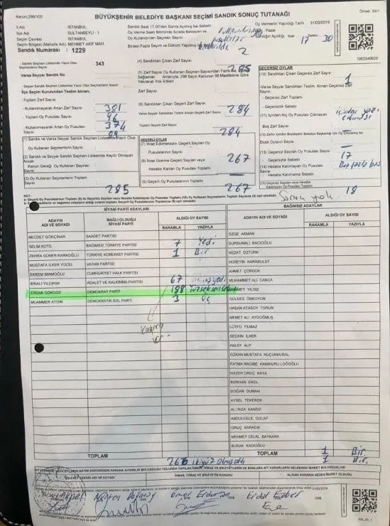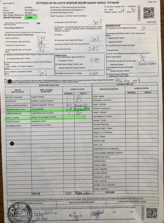 31 Mart Yerel Seçimleri'nde oy sayımında büyük usulsüzlükler yapıldığı tespit edildi. İstanbul'un birçok ilçesinde Cumhur İttifakı'nın AK Parti İstanbul Büyükşehir Belediye Başkan Adayı Binali Yıldırım'ın oylarının seçim sandık tutanağına yanlış aktarıldığı ortaya çıktı.