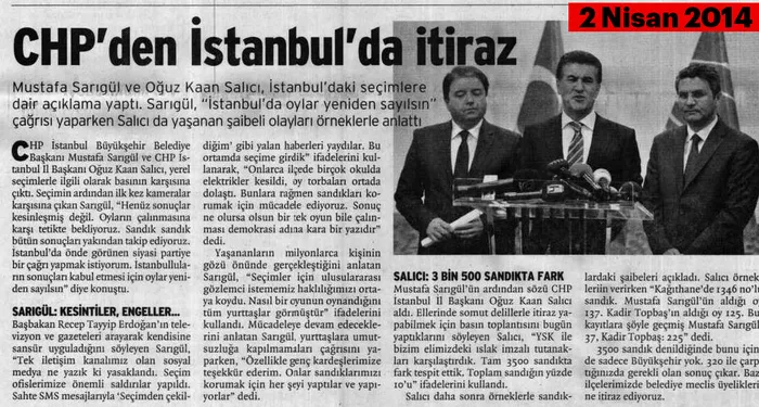 Bugün AK Parti'nin seçim usulsüzlüklerini ortaya çıkarmasını engellemeye çalışan ve YSK'ya yapılan başvuruları eleştiren CHP yönetiminin 2014 yerel seçimlerinde İstanbul'da bütün sandıklara itiraz ettiği ortaya çıktı. CHP 2014 yılında gerçekleşen İstanbul Büyükşehir Belediye Başkanlığı seçiminde 1 milyon oyun hatalı olduğunu açıklamıştı. İstanbul Büyükşehir Belediye Başkan Adayı Mustafa Sarıgül, partisinin İstanbul İl Başkanı Oğuz Kaan salıcı ile birlikte basın toplantısı düzenlediği ortaya çıktı. 3 bin 500 den fazla sandıktaki sonuçlarda hata tespit edildiğini ve sonuca itiraz edeceklerini belirterek, AK Parti'den itiraza destek vermesini isteyerek, "'Sorun yok' diyorsanız çekinecek bir şey yoktur" demişti. Oğuz Kaan Salıcı da, "Elimizde somut verilerle bir itiraz yapabilmek için bu toplantıyı bugün yaptık. YSK ile bizim elimizdeki ıslak imzalı tutanakları karşılaştırdık. Tam 3500 sandıkta fark tespit ettik. Toplam sandığın yüzde 10'u. Fatih ilçemizde birkaç örnek var. 3034 no'lu sandık. Belediye başkanı ve belediye meclis üyeliği tutanağıdır. Bir başkası Kağıthane 1346 no'lu sandık… Mustafa Sarıgül'ün aldığı oy 137. Kadir Topbaş'ın aldığı oy 125… Bu, kayıtlara şöyle geçmiş Mustafa Sarıgül: 37, Kadir Topbaş: 225… 3500 sandık denildiğinde bunu içinde sadece Büyükşehir yok… 320 ile çarptığınızda gerekli olan sonuç çıkar" demişti. Aynı CHP'nin İstanbul Büyükşehir Belediye Başkan adayı Ekrem İmamoğlu ise seçim sonuçlarının itirazlara karşı çıkıyor ve resmî sonuç açıklanmadan kendisini belediye başkanı ilan ediyor. Dahası AK Parti'nin en demokratik hakkı olan YSK'ya başvurusunu da eleştirerek halkı adeta sokağa davet ediyor.