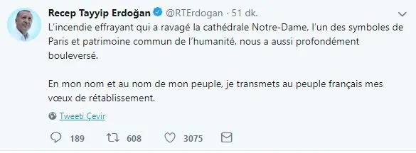 "Paris'in sembollerinden biri olan ve insanlığın ortak mirası Notre Dame Katedrali'ni tahrip eden korkunç yangın bizi de derinden sarstı. Kendim ve halkım adına, Fransız halkına geçmiş olsun dileklerimi iletiyorum."