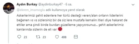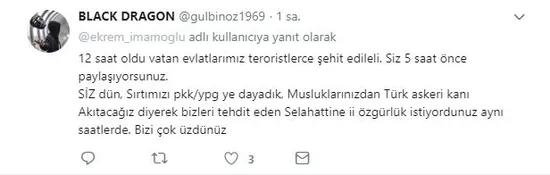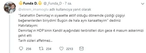 CHP'li Ekrem İmamoğlu, "Başkan APO'nun heykelini dikeceğiz" diyen HDP'nin tutuklu eski genel başkanı Selahattin Demirtaş'ı öve öve bitirememişti. Demirtaş için "Gerçekten de barışçıl, uzlaşmacı ve evrensel değerleri öne çıkaran dili vardı." ifadelerini kullanan Ekrem İmamoğlu'na CHP seçmeni de tepki göstermişti. Türkiye-Irak sınırında devam eden operasyonlarda şehit düşen askerler için başsağlığı mesajı paylaşan İmamoğlu'na sosyal medyadan tepki yağıyor. Kullanıcılardan biri, İmamoğlu'nun paylaşımının altına, "Demirtaş'ın HDP'sinin Kandil ayağındaki teröristleri dün gece 4 masum askerimizi şehit etti. Tarih sizleri affetmez." diye yazdı.