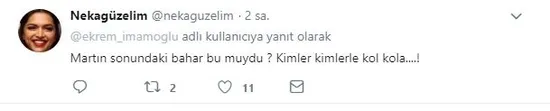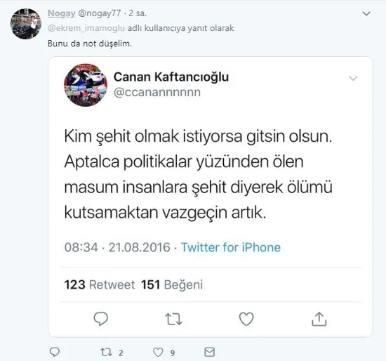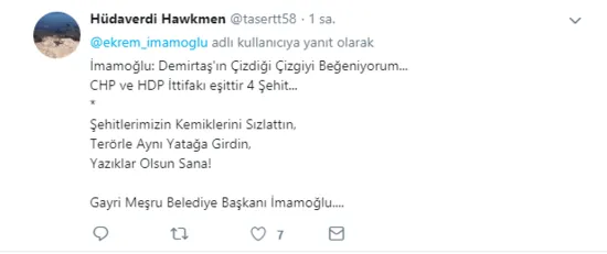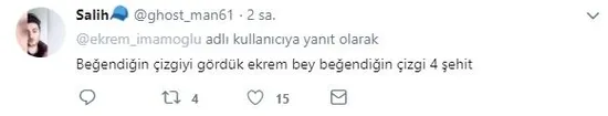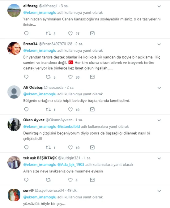 Türkiye'nin yüreğini yakan haber sonrası "Demirtaş'ın çizgisini beğeniyorum" diyen İstanbul Büyük Şehir Belediye Başkanı Ekrem İmamoğlu'nun attığı taziye tweetine vatandaşlardan çok sert tepkiler geldi. Vatandaşlar "Bu Timsah gözyaşları" "İki yüzlü.... ve "Gece kurtla bir olup kuzuyu yedikten sonra, sabah çobanla ağlamak bu olmalı!" yorumları yaptı.