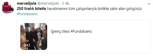 İstanbul havalimanında çalışan bir kadına ağza alınmayacak hakaretler eden Funda Esenç isimli kadın sosyal medyada büyük tepki ile karşılandı. Uçağı rötar yaptı diye çalışan başka bir kadına hakaretler yağdıran Funda Esenç'e diğer yolcuların da tepki gösterdiği kamera kayıtlarında görülüyor.