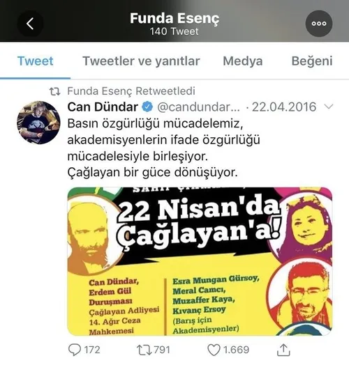 Funda Esenç, casusluktan aranan vatan haini Can Dündar'ın Twitter üzerinden yaptığı provokasyon çağrısına da sosyal medya hesabından destek vermiş. İşte o paylaşımı....