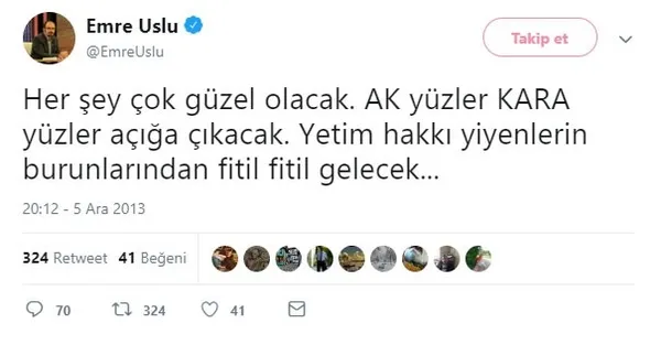 Yine Emrullah Uslu'nun 7 Ocak 2014 günü "Benden söylemesi her şey çok güzel olacak", 22 Şubat 2014 günü "Her şey çok ama çoook güzel olacak. Sadece birazcık sabır", 29 Mart 2014 günü "Önder Aytaç gözaltına alınmış. Yaşasın zalimler için cehennem deme zamanı. Enseyi karatmayın oyunuzu verin. Her şey çok güzel olacak", 16 Ocak 2014 günü "Her şey çok güzel olacak bekleyin gözlerinizle göreceksiniz. Kış güneşine tomurcuk verenler donacak…" ve 18 Ekim 2014 günü "O her şeyi en güzel şekilde yarattı' Her şey çok güzel olacak…" şeklinde tweetler attığı tespit edildi.