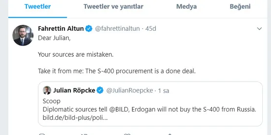 Cumhurbaşkanlığı İletişim Başkanı Prof. Dr. Fahrettin Altun, Alman Bild gazetesinin dış politika editörü Julian Röpcke'nin, Türkiye'nin Rusya'dan S-400 satın almayacağı yönündeki ifadelerine, "Sevgili Julian, kaynaklarınız hatalı. Bilgiyi benden alın: S-400 satın alma işlemi tamamlandı." şeklinde yanıt verdi.