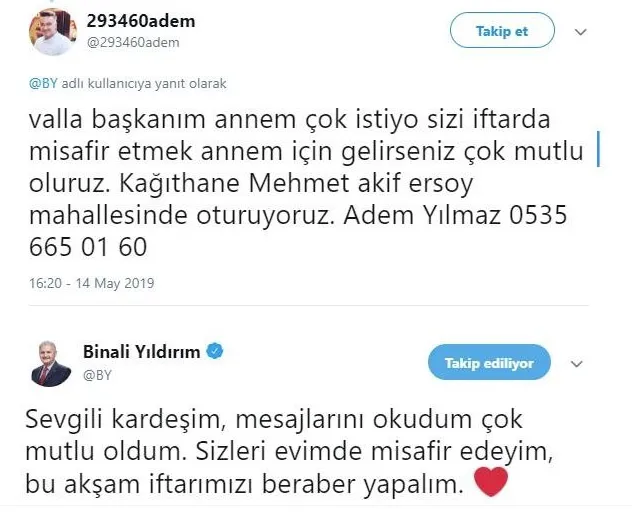 Kendi adresini ve telefon numarasını yazarak Binali Yıldırım'ı iftara çağıran Adem Yılmaz, "Valla başkanım annem çok istiyo sizi iftarda misafir etmek annem için gelirseniz çok mutlu oluruz. Kağıthane Mehmet Akif Ersoy mahallesinde oturuyoruz." ifadelerini kullandı.