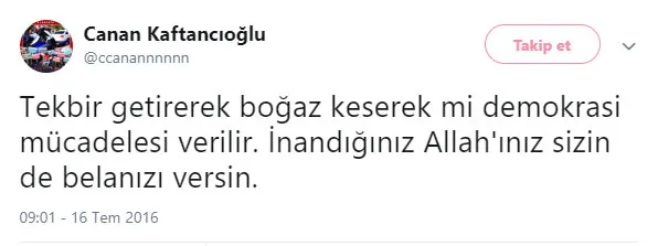 15 Temmuz 2016 tarihinde "Tekbir getirerek boğaz kesilerek mi demokrasi mücadelesi verilir. İnandığınız Allah'ınız sizin de belanızı versin" şeklindeki paylaşımı kendisinin yaptığını kabul eden CHP'li Kaftancıoğlu, "Orada dini değerleri aşağılama gibi bir durum söz konusu değildir. İnançlı birinin asla böyle bir şeyi yapmayacağını ifade etmek istedim. Bela okumanın da suç olduğunu düşünmüyorum. İfade ettiğim gibi hakkımda kovuşturma ve soruşturma izni verilmiş olan Twitter paylaşımlarımın biri dışında hepsini ben yaptım. Canan Kaftancıoğlu kullanıcı isimli hesap bana aittir. Halen de kullanmaktayım" dedi.