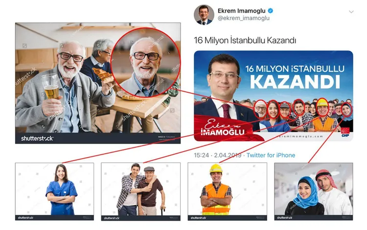CHP İstanbul Büyükşehir Belediye Başkan adayı Ekrem İmamoğlu'nun afişlerindeki skandallara bir yenisi daha eklendi. Daha önce afişte ''16 milyon İstanbullu kazandı'' ifadesi ile İmamoğlu ve birçok kişinin fotoğrafı yer aldı. Ancak İmamoğlu'nun afişindeki kişilerin gerçek vatandaşlar değil, internet üzerinden fotoğraf kolajlamak için kullanılan bir sitedeki yabancı kişilerden oluştuğu anlaşılmıştı. Öyle ki İmamoğlu'nun afişinde kafasında takke olan yaşlı kişinin daha önce bira reklamlarında görüldüğü ortaya çıkmıştı.