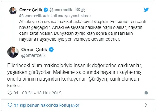 AK Parti Sözcüsü Ömer Çelik, sosyal medya hesabından yaptığı açıklamada, "Darbecilerin ellerinde en acımasız araçlar ve yöntemler var. Ama Mursi’nin naaşından korkuyorlar." dedi.