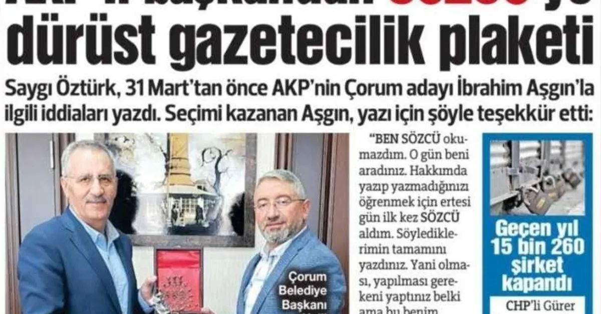 Çorum Belediye Başkanı Dr. Halil İbrahim Aşgın, Sözcü gazetesi köşe yazarı Saygı Öztürk’ün Çorum ziyaretinin ardından Sözcü Gazetesinde çıkan “AKP’li Başkandan Sözcü’ye Dürüst Gazetecilik Plaketi” başlıklı yazısının gerçeği yansıtmadığı gerekçesiyle tekzip (yalanlama) yazısı gönderdi.