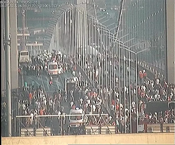 Güvenlik kameralarına yansıyan görüntülerde, mahşeri bir kalabalığın yaşandığı Boğaziçi Köprüsü'nde darbeci askerlerin gözlerini kırpmadan, Türk bayrağını dalgalandıran vatandaşları hedef aldığı görülüyor.