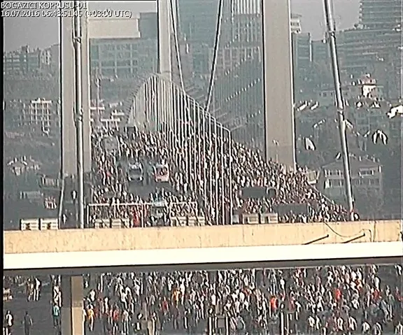 Bir taraftan köprüye giden çevre yolları iş makineleriyle kapatılıyor. Kalabalık vatandaş gruplarının E-5'teki ilerleyişi de güvenlik kameralarınca kaydediliyor.