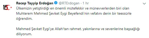 Erdoğan, Twitter paylaşımında, "Ülkemizin yetiştirdiği en önemli mütefekkir ve münevverlerden biri olan Muhterem Mehmed Şevket Eygi Beyefendi'nin vefatını derin bir teessürle öğrendim." ifadesini kullandı.
