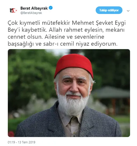 Hazine ve Maliye Bakanı Berat Albayrak yazar Mehmet Şevket Eygi'nin vefatı üzerine sosyal medya hesabından taziye mesajı yayınladı.