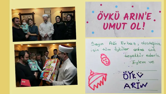 Erbaş'ın ziyaret ettiği Öykü Arin Yazıcı ve ailesinin fotoğraflarının da bulunduğu paylaşımdaki kartta, "Öykü Arin'e umut ol" sloganı ile "Sayın Ali Erbaş, desteğin için tüm Öyküler adına çok teşekkür ederiz. Eylem ve Öykü Arin." ifadeleri yer aldı.