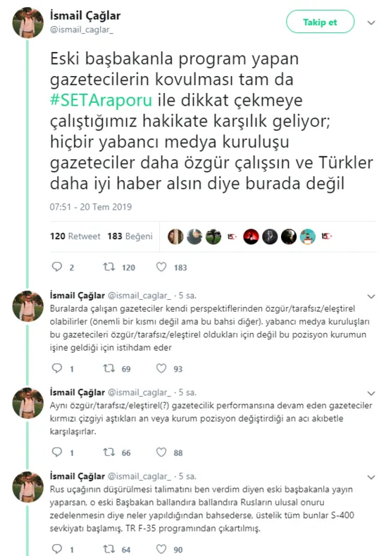 "Eski başbakanla program yapan gazetecilerin kovulması tam da #SETAraporu ile dikkat çekmeye çalıştığımız hakikate karşılık geliyor; hiçbir yabancı medya kuruluşu gazeteciler daha özgür çalışsın ve Türkler daha iyi haber alsın diye burada değil. Buralarda çalışan gazeteciler kendi perspektiflerinden özgür/tarafsız/eleştirel olabilirler (önemli bir kısmı değil ama bu bahsi diğer). Yabancı medya kuruluşları bu gazetecileri özgür/tarafsız/eleştirel oldukları için değil bu pozisyon kurumun işine geldiği için istihdam eder. Aynı özgür/tarafsız/eleştirel(?) gazetecilik performansına devam eden gazeteciler kırmızı çizgiyi aştıkları an veya kurum pozisyon değiştirdiği an acı akıbetle karşılaşırlar.