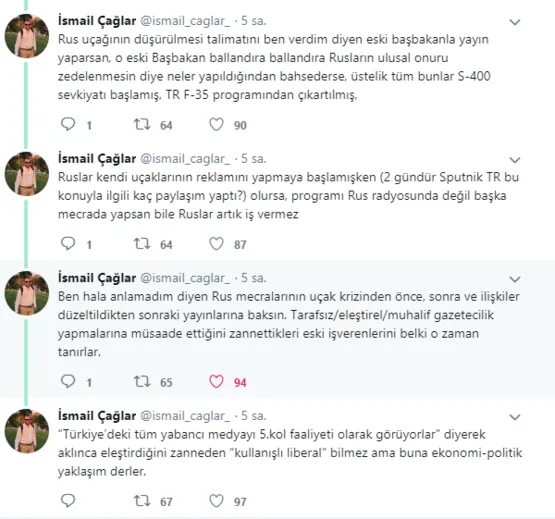 Ben hala anlamadım diyen Rus mecralarının uçak krizinden önce, sonra ve ilişkiler düzeltildikten sonraki yayınlarına baksın. Tarafsız/eleştirel/muhalif gazetecilik yapmalarına müsaade ettiğini zannettikleri eski işverenlerini belki o zaman tanırlar.