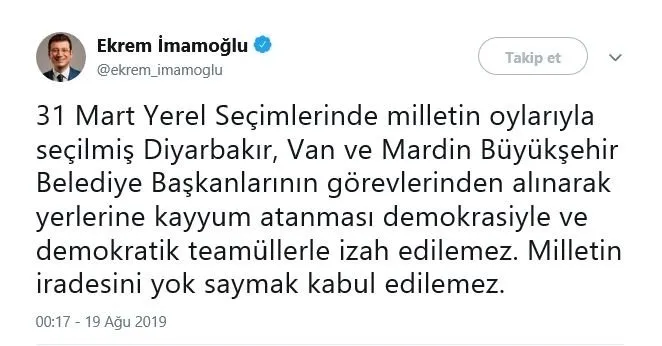 İstanbullunun hizmet beklediği bugünlerde Bodrum'da denizin keyfini çıkartan İmamoğlu, terör örgütü PKK/YPG'ye maddi ve yaşam destek yardımları yapıldığı belgelenmesi üzerine Diyarbakır, Van ve Mardin belediyelerine atanan kayyumları eleştirdi. İmamoğlu, İstanbul'da olmadığı için sosyal medya üzerinden açıklama yaparak "31 Mart yerel seçimlerinde milletin oylarıyla seçilmiş Diyarbakır, Van ve Mardin Büyükşehir Belediye Başkanlarının görevlerinden alınarak yerlerine kayyum atanması demokrasiyle ve demokratik teamüllerle izah edilemez. Milletin iradesini yok saymak kabul edilemez" ifadelerini kullandı.